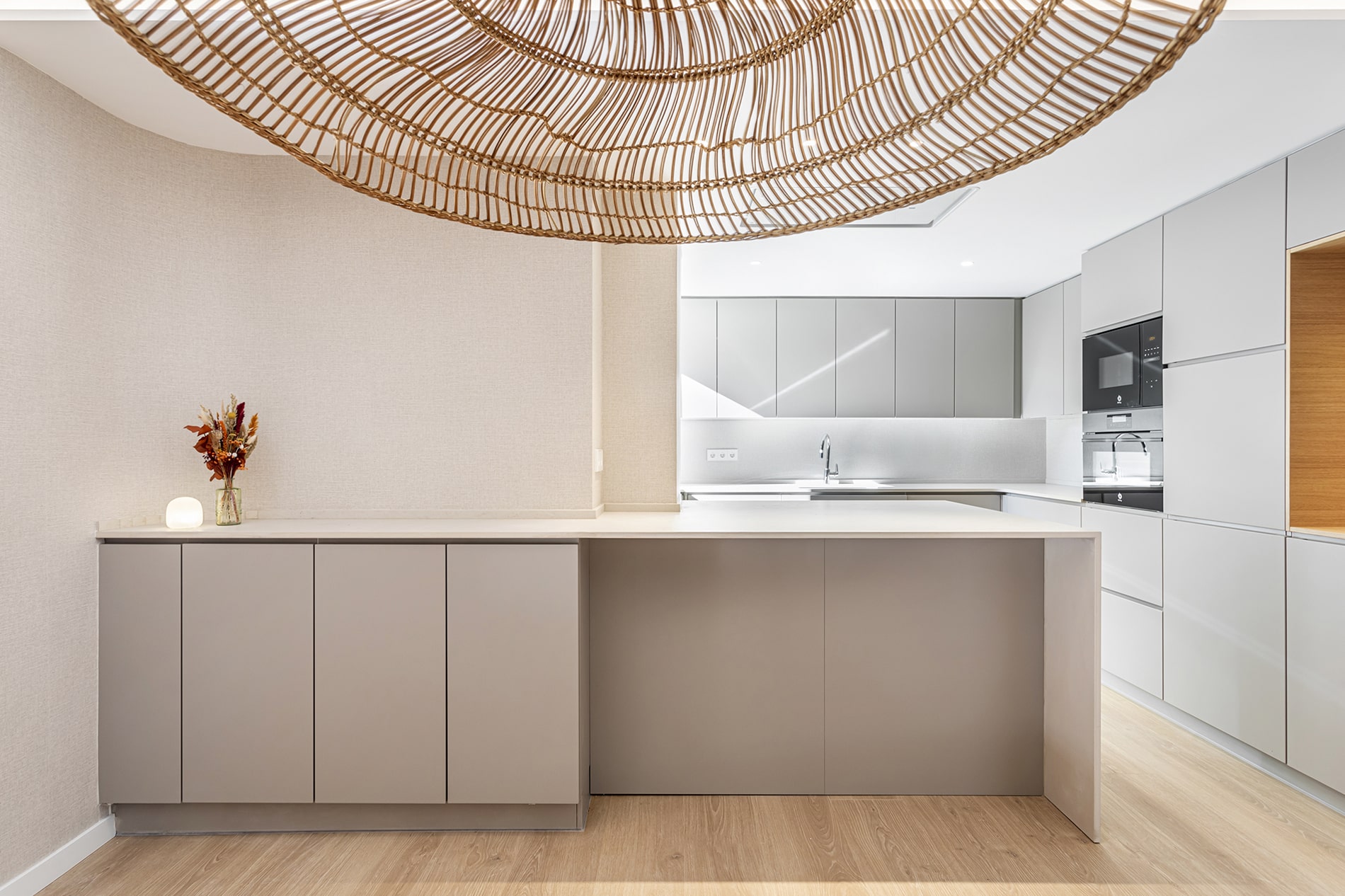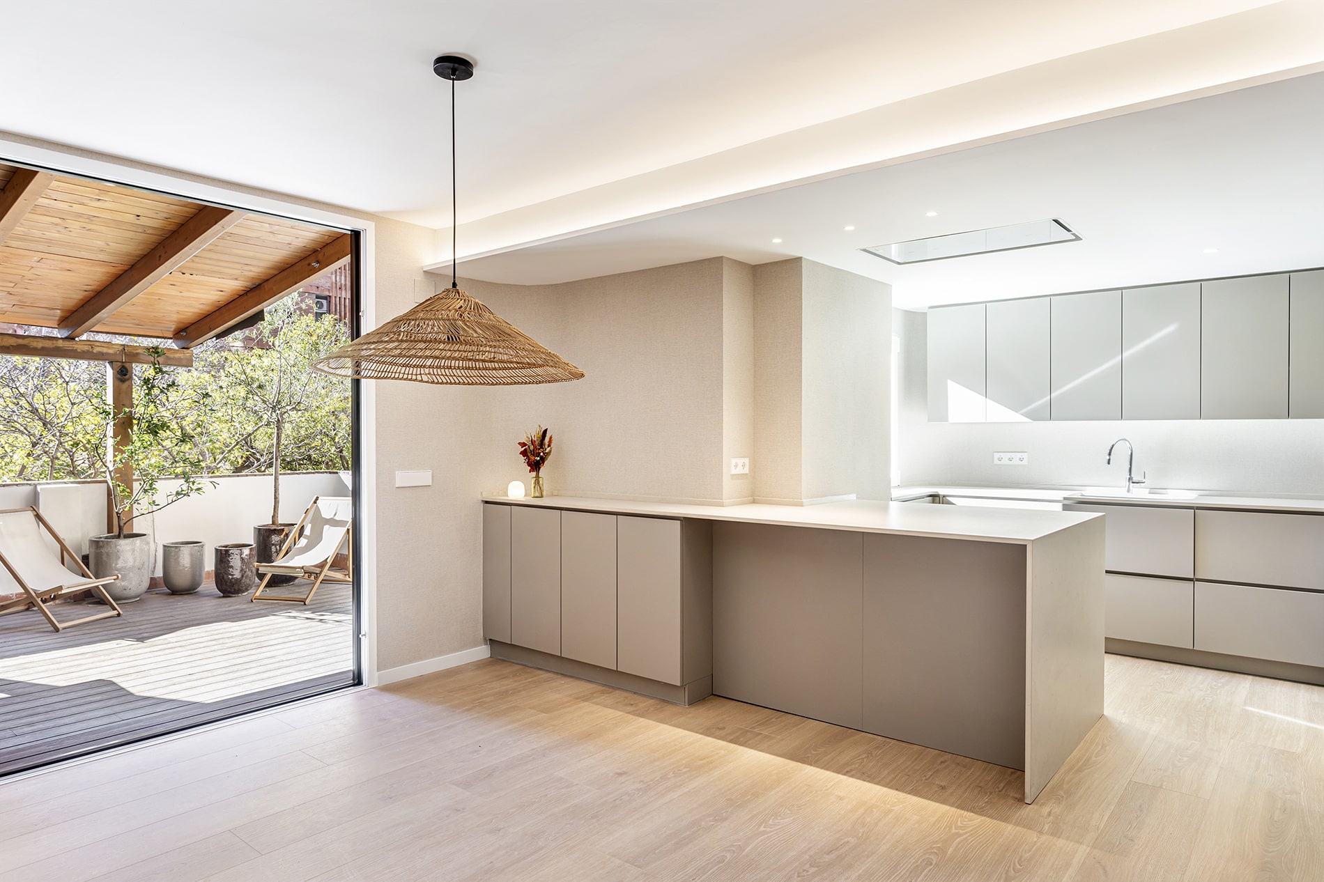 La premisa del cliente, y nuestro principal foco, fue abrir la cocina al salón y conseguir que toda esa zona amplia recayera a la terraza, mediante la apertura de un gran ventanal elevable de 4 metros.
