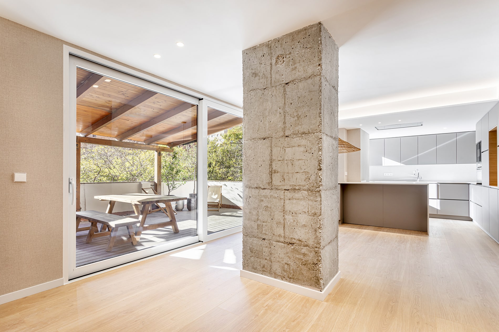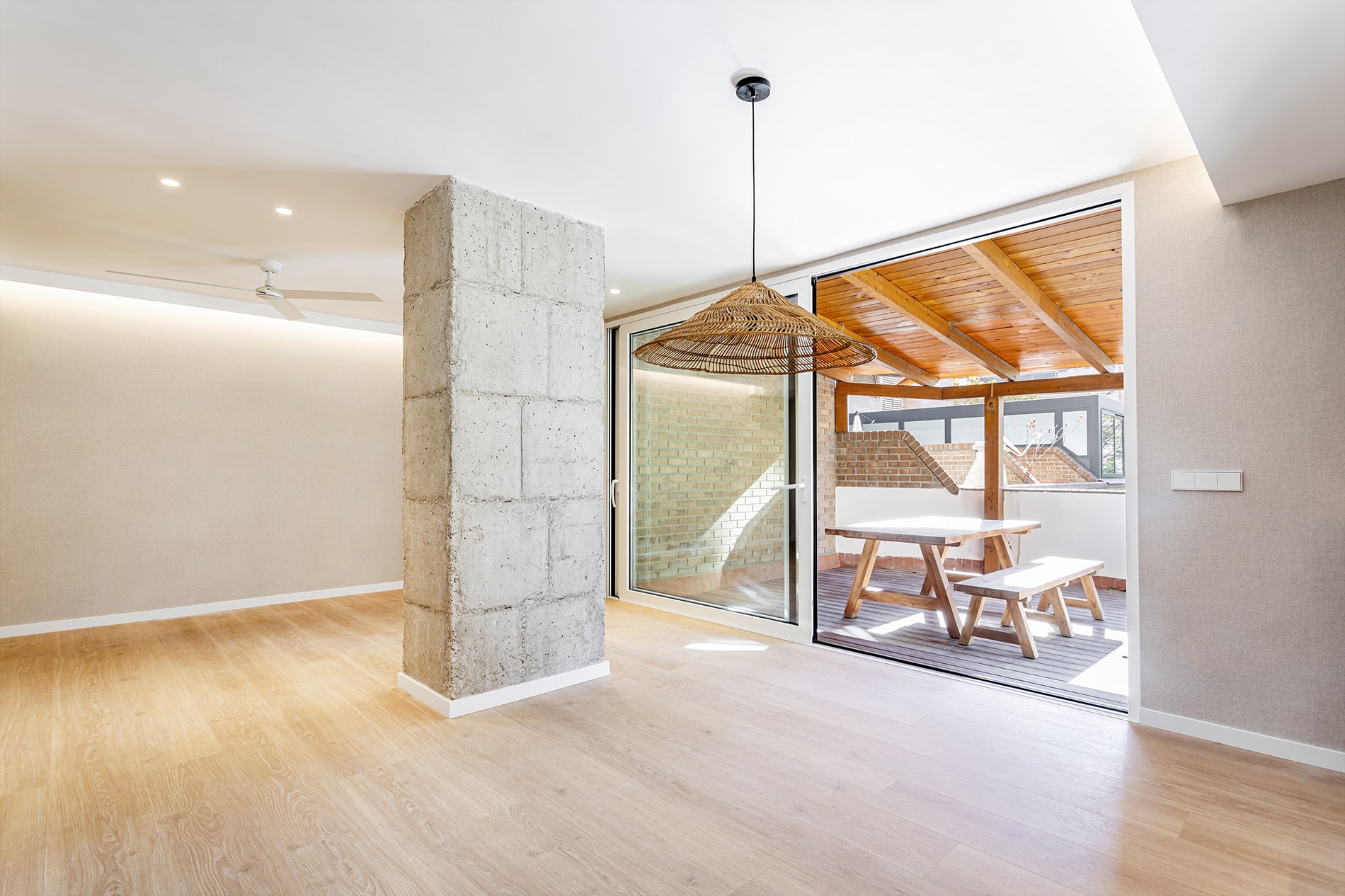 Esta reforma es muy interesante porque, literalmente, le hemos dado la vuelta a la vivienda. La terraza daba a los dormitorios, mientras que el salón y la cocina quedaban más oscuros y recogidos en el interior de la casa, una distribución poco coherente.